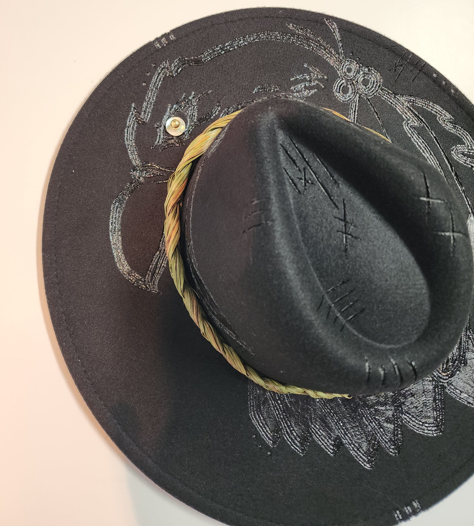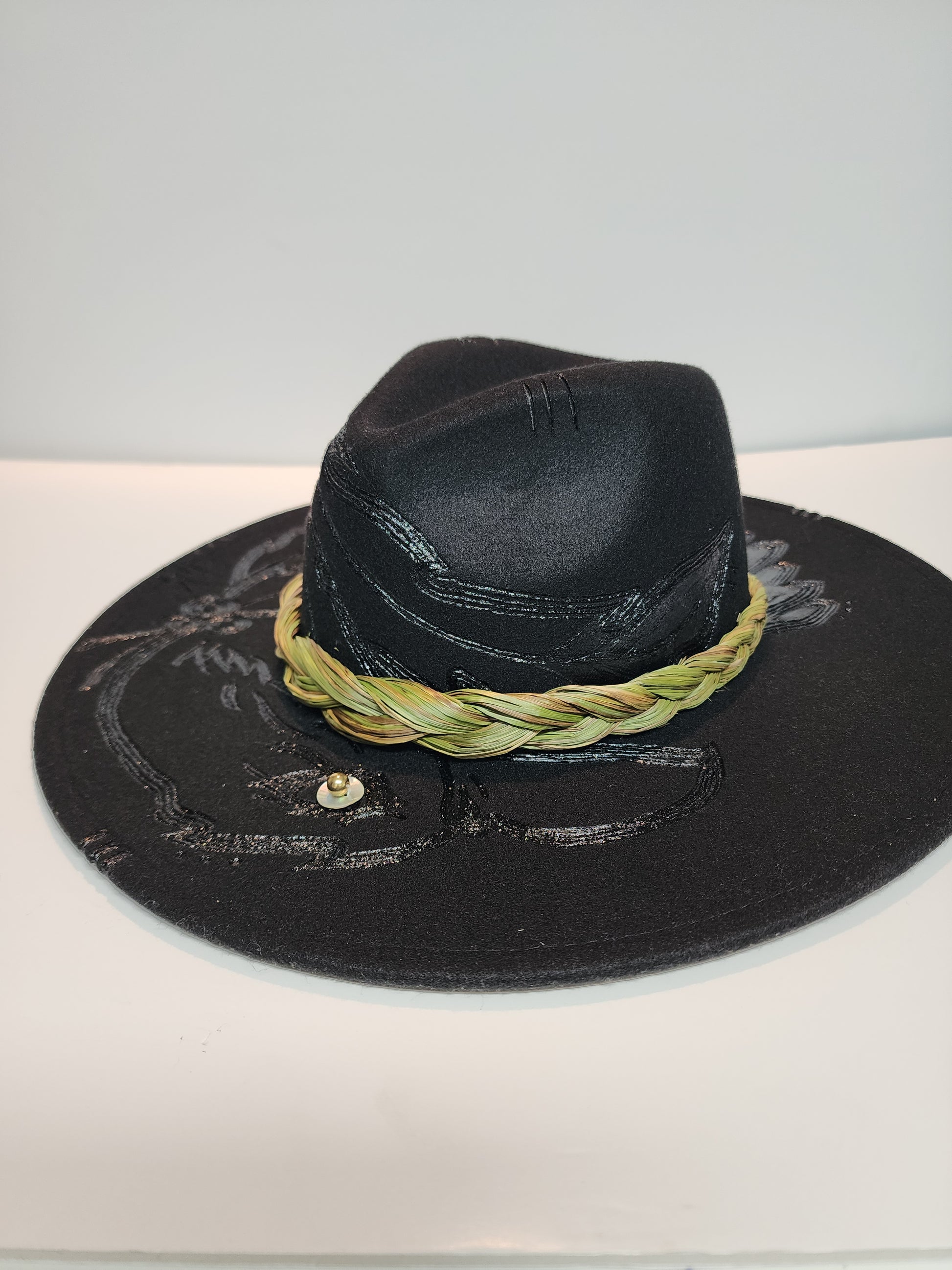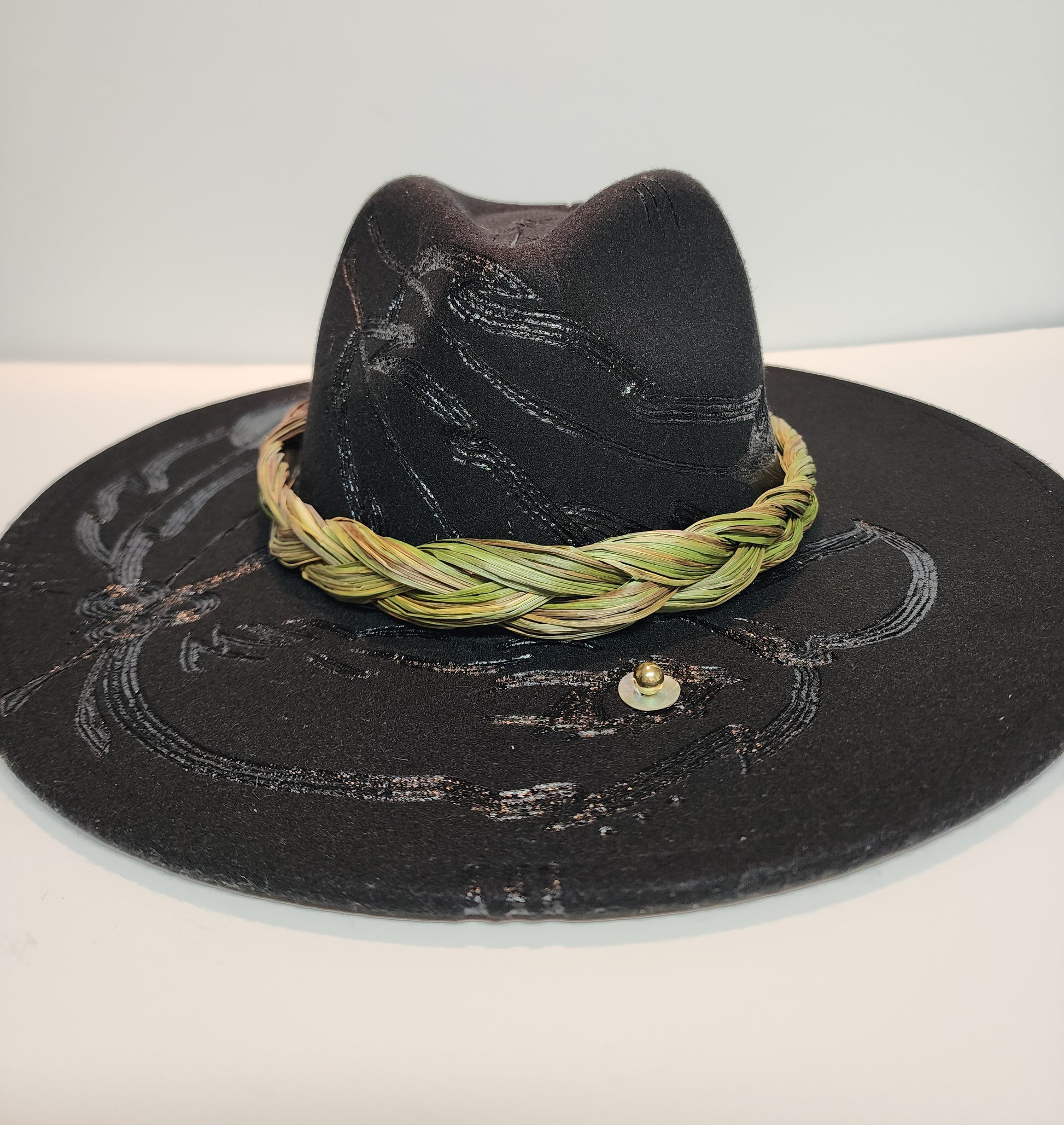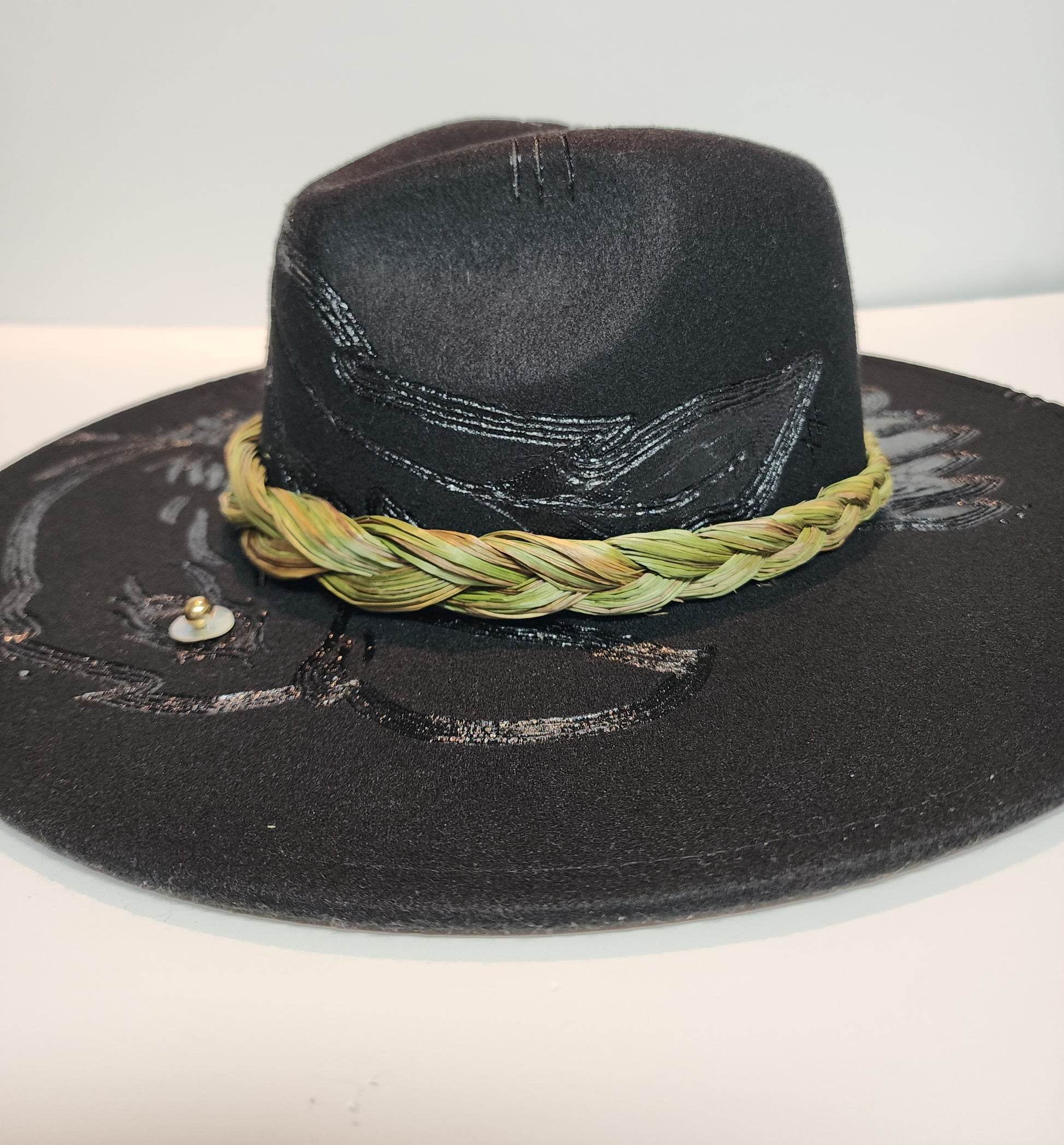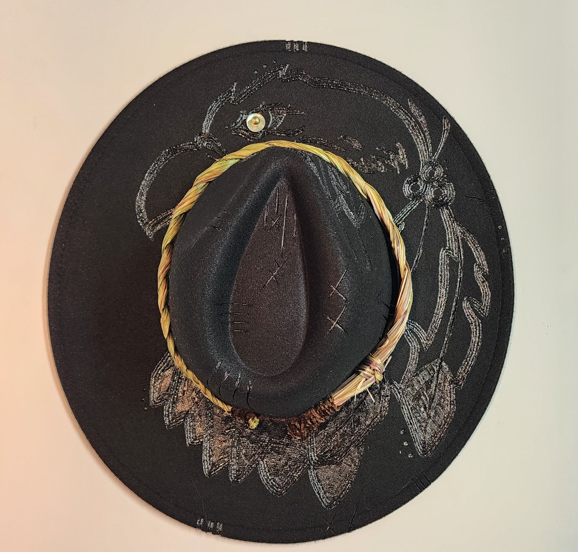 One of a kind hat featuring intricate burnt half design of an eagle and feathers, adorned with a sweetgrass braid band.